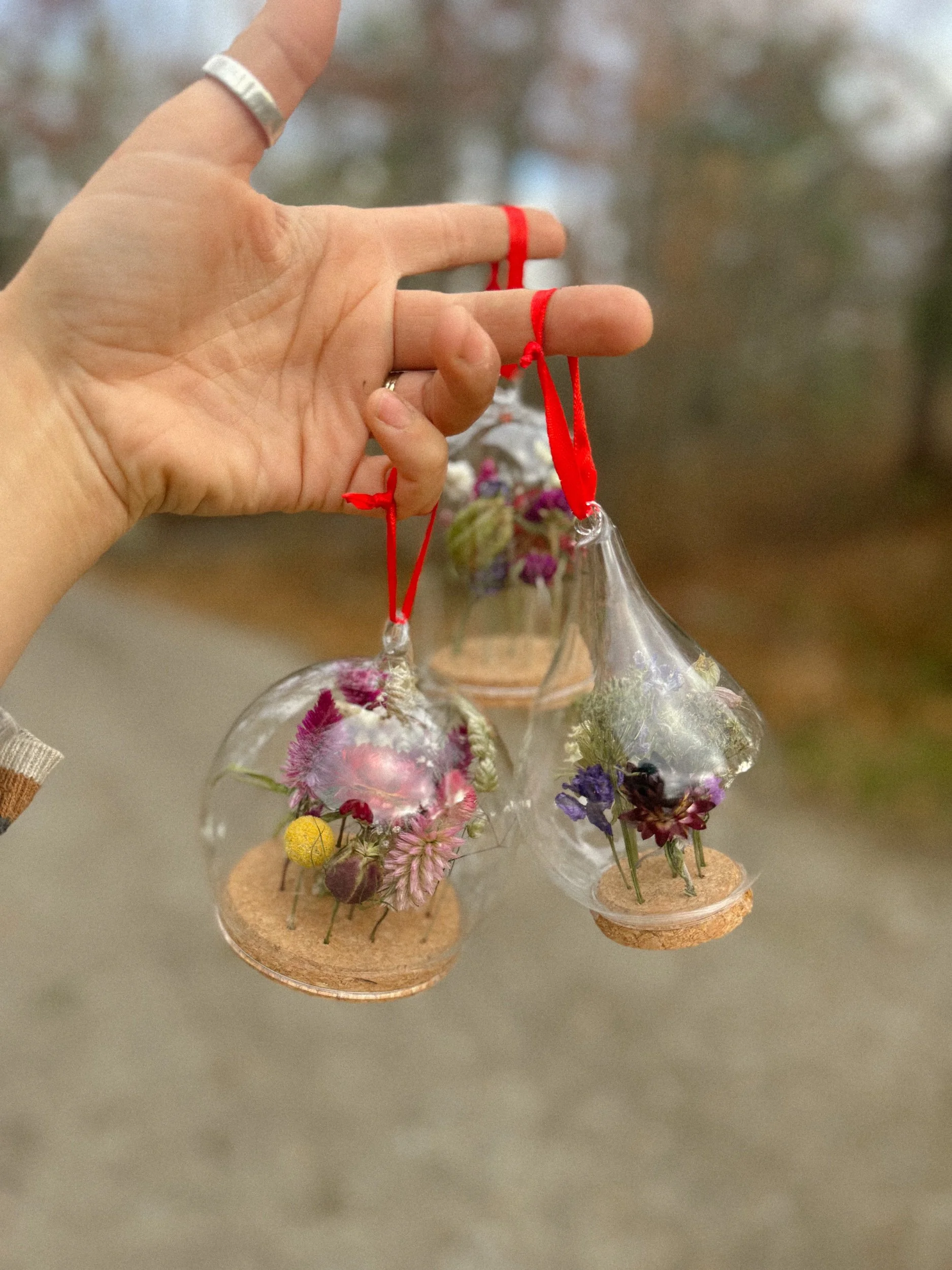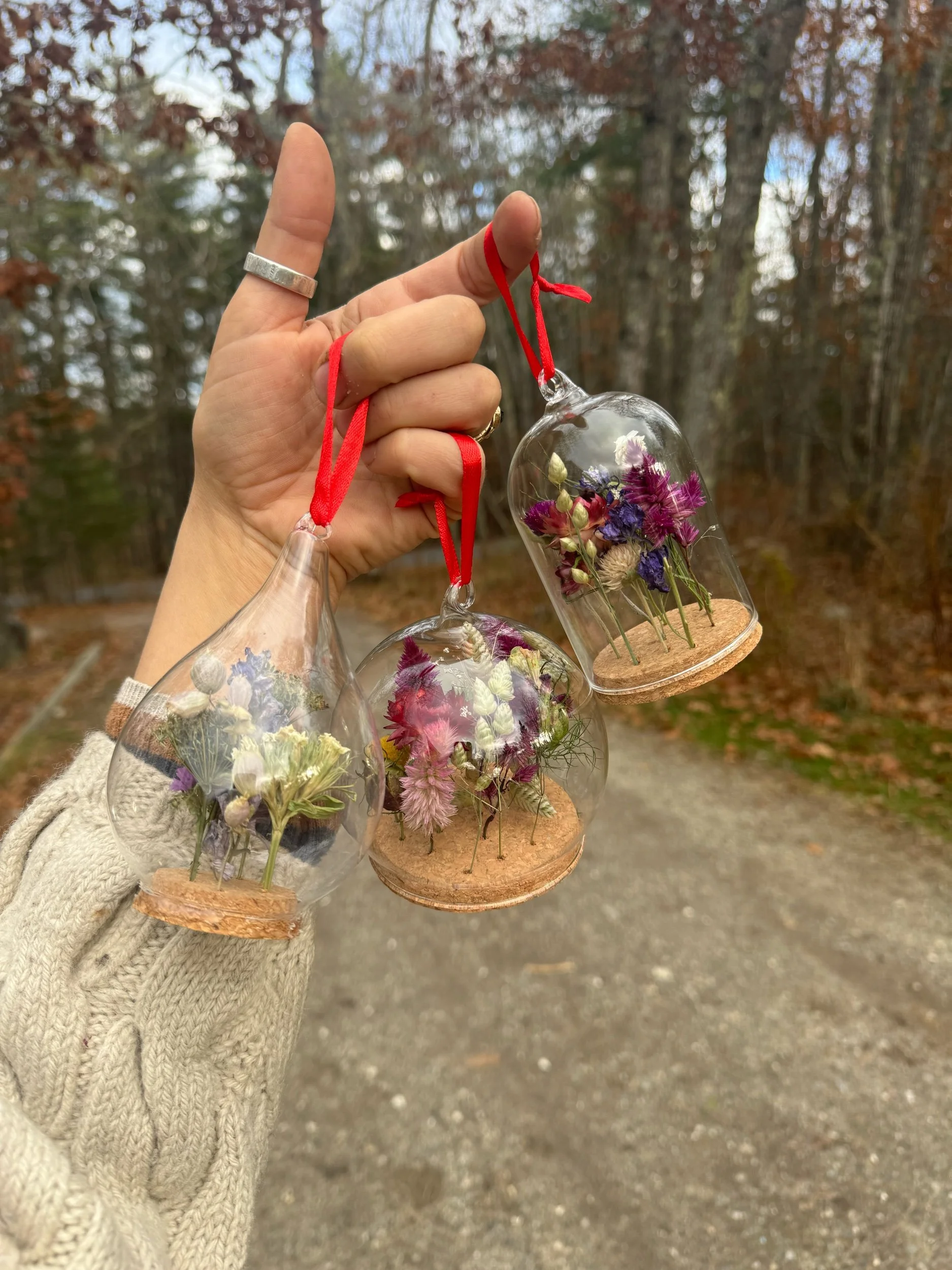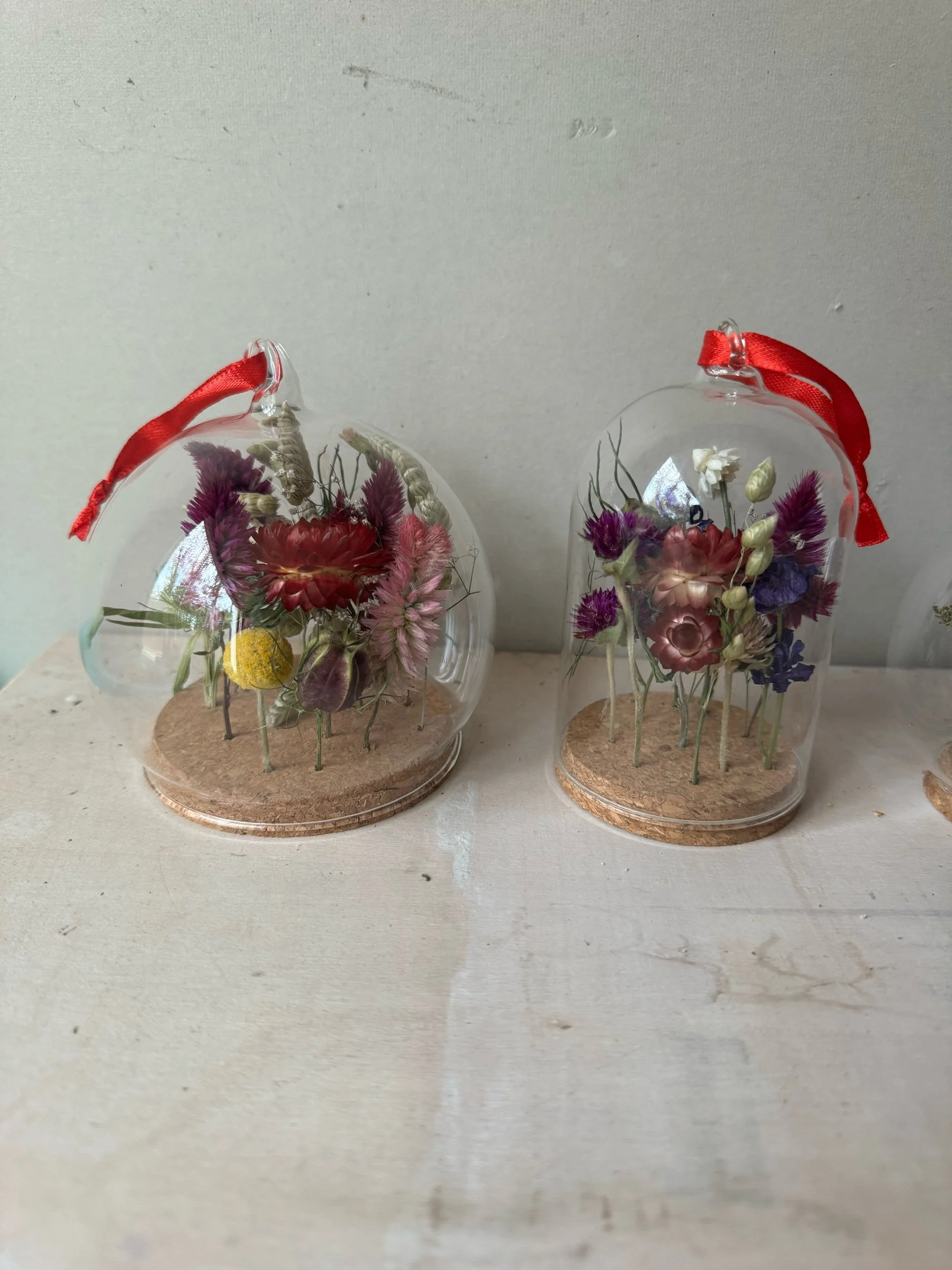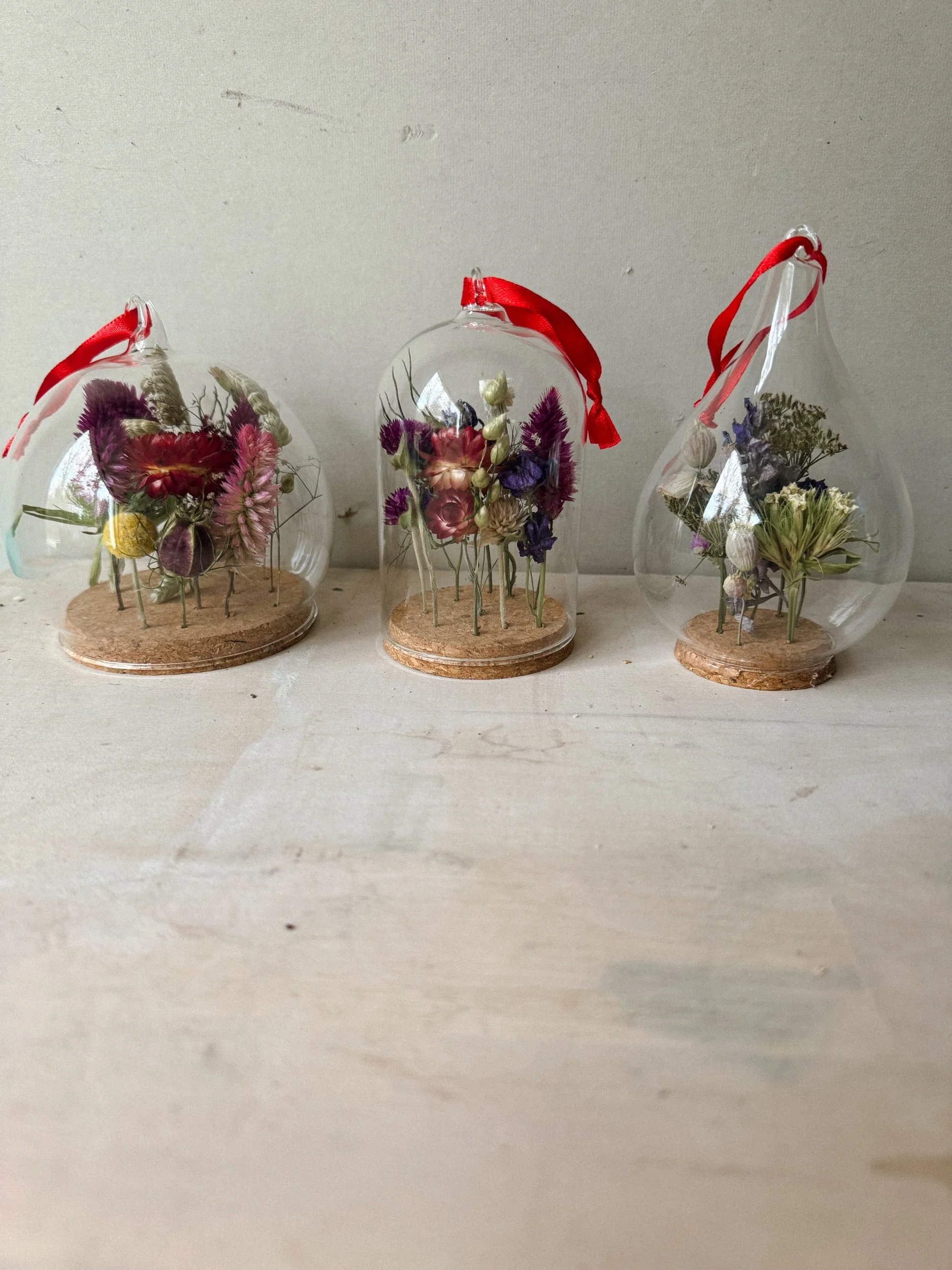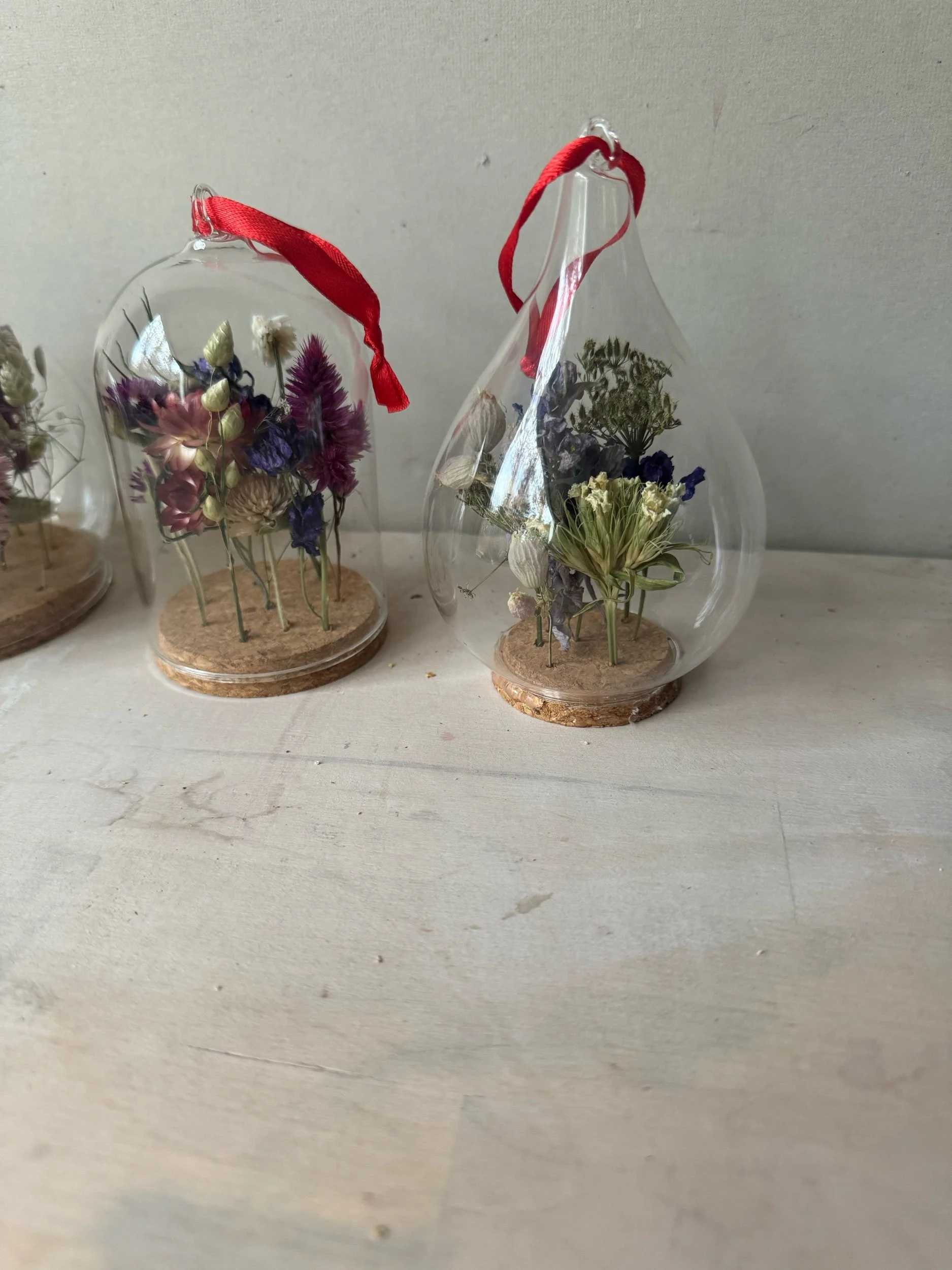 Enjoy a miniature world of flowers with these very sweet cloche ornaments. Each flower is secured into a hole drilled in the cork, and creates an air tight seal when placed into either the classic cloche, the teardrop or the sphere. Each arrangement is one of a kind and will be created upon your order with dried flowers from Fogwood.