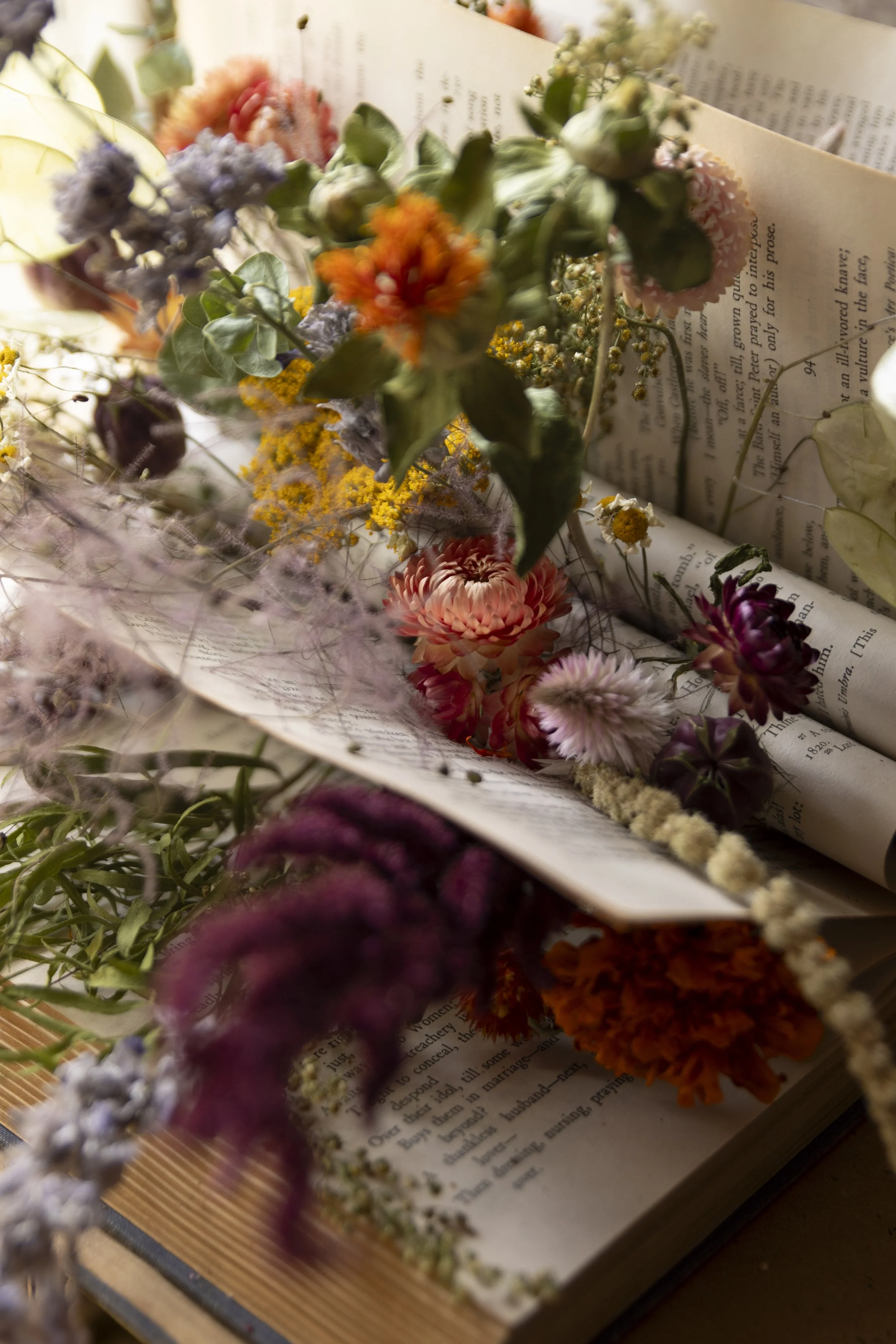 The blooming book concept is something I have fallen deeply for. I have yet to find a more perfect pairing than an old book and dried flowers. The process of creating these is meditative and relatively simple. A perfect candidate for a unique dried flower workshop!